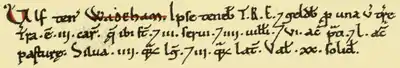 Ulf, who before 1066 held Wadeham and other manors in Devon and elsewhere in Wessex, and still retained Wadeham under the Saxon King Edward the Confessor,[4] was one of only twenty[5] Saxon thanes in Devonshire who survived the Norman Conquest of 1066, retained their antiquated high status as thanes, and became tenants-in-chief under the new Norman king. However, he appears less prominent than some others of his fellow surviving Devonshire thanes who held up to eleven manors each under King William the Conqueror after 1086, whilst Ulf only added the manor of Axminster which he held from William Cheever, alias Chièvre after 1086 from the King in desmesne.[6] The Domesday text is as follows: