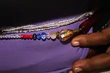 Waist beads are a piece of jewelry that is worn on the belly, waist, or hip area. These pieces, originating in Africa, are traditionally worn by women as a symbol of waist size, beauty, sexual sensations, femininity, fertility, well-being, and maturity. To make the ornament, beads are laced on thread, wire, or elastic string.[1]