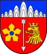 The municipality's arms might be described thus: Gules an arrow argent, point to base, between, fesswise, a cinquefoil Or pierced azure and a lion's head crowned erased of the third, on a chief of the fourth nine jets of water of the second, the middle one highest, the others each descending in height to the sides.