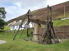 The beam engine allowed miners to continue working in the Straitsteps mine, and assuming that there were two strokes of the beam per minute, this engine would have been able to lift around 7,280 litres per hour (1,600 imp gal/h) and requiring little attention it would have been left to do this twenty-four hours a day.[16] The wooden bucket was fed from a cistern above and once the weight of water was greater than the water above the pump piston the beam was lifted, carrying water from up to 28 metres (92 ft) below ground into a wood lined culvert which carried it off to the nearby burn. Periodically the weight of the piston was adjusted so that it remained heavier than the empty bucket, ensuring that the beam fell to start the cycle again.[17]