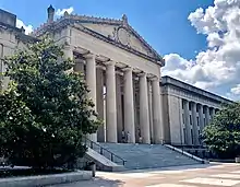 A three-person committee of out-of-state architects was commissioned to choose an architect and designer for the project. The committee designed a competition that would narrow the field to three in-state and three out-of-state finalists, who would then compete for the final design. The ultimate winner was Nashville architect Edward Dougherty, affiliated as an associate with McKim, Mead, and White of New York. He designed a memorial in the classical architectural style consisting of an auditorium and an office block separated by a court of honor. The central courtyard is surrounded by Doric colonnade and portico recalling the entrance through the Propylaeon to the Athenian Acropolis.[2] Above the front steps to this entrance, a carving reads: