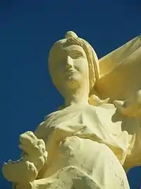 Long Somme | Long's war memorial features a bronze cast by the foundry Fonderies Montagutelli Frères of Paris. This was the work of the sculptor Georges Chauvel (1886–1962). It is entitled "La France couronnant un soldat blessé " and shows a wounded soldier receiving a crown of laurels from a female figure representing France. On the pedestal itself there is a bas-relief this showing the mobilisation of Long and featuring the then mayor of Long and the men of Long killed in the war all responding to the call to mobilise.[16] |