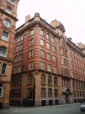 Behrens Warehouse is on the corner of Oxford Street and Portland Street. It was built for Louis Behrens & Son by P Nunn in 1860. It is a four-storey predominantly red brick build with 23 bays along Portland Street and 9 along Oxford Street.[19] The Behrens family were prominent in banking and in the social life of the German Community in Manchester.[25] [26]