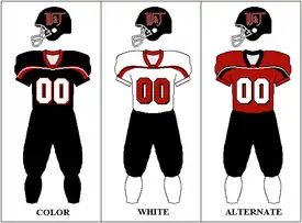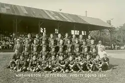 At the same time its activities was becoming more scrutinized, the football team became more successful. The season finale in 1896 at Exposition Park in Pittsburgh was one of the largest crowds in western Pennsylvania history, when an overflow crowd of 12,000 watched W&J defeat Duquesne Country and Athletic Club 4–0.[11] But was the September 29, 1897, game against the University of Pennsylvania Quakers that marked the "birth of big-time football" at W&J.[11] The Red and Black lost 18–4 to the eventual national champions, but W&J counted it a moral victory, since they were missing 4 of their 11 starters due to new eligibility requirements.[11] In a game against Denison University on Sept. 19, 1908, W&J became the first college football team in history to wear numbered uniforms.[12][13]