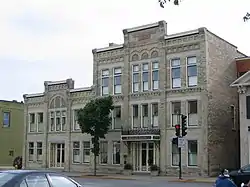 - H. Groth's Hardware at W63 N696 Washington Ave is a two-story building with a hip roof.[16] Constructed in 1873 with walls of coursed limestone and Italianate decoration, it initially housed Groth's a hardware store. In 1880 John Bruss opened a dry goods and grocery store in part of the building.[2]