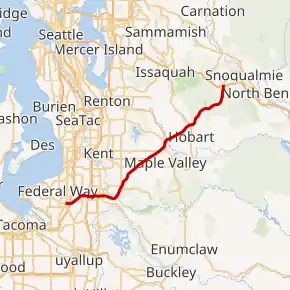 State Route 18 (SR 18) is a 28.41-mile-long (45.72 km) state highway in the U.S. state of Washington, serving southeastern King County. The highway travels northeast, primarily as a controlled-access freeway, from an intersection with SR 99 and an interchange with Interstate 5 (I-5) in Federal Way through the cities of Auburn, Kent, Covington, and Maple Valley. SR 18 becomes a two-lane rural highway near Tiger Mountain as it approaches its eastern terminus, an interchange with I-90 near the cities of Snoqualmie and North Bend.