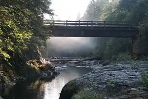 The Washougal River is a 33-mile (53 km) tributary of the Columbia River in the U.S. state of Washington.[3] Its headwaters and upper 21 miles (34 km) are in Skamania County in the Gifford Pinchot National Forest, and its lower 12 miles (19 km) are in Clark County. The river, which meets the Columbia near the cities of Washougal and Camas, is a popular stream for fishing, swimming, and boating.[3]