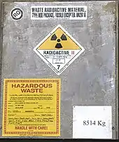 Waste that is to be disposed of at WIPP must meet certain "waste acceptance criteria".[48] It accepts transuranic waste generated from DOE activities. The waste must have radioactivity exceeding 100 nanocuries (3.7 kBq) per gram from TRUs that produce alpha radiation with a half life greater than 20 years. This criterion includes plutonium, uranium, americium, and neptunium among others. Mixed waste contains both radioactive and hazardous constituents, and WIPP first received mixed waste on September 9, 2000. Mixed waste is joint-regulated by the EPA and the New Mexico Environment Department.