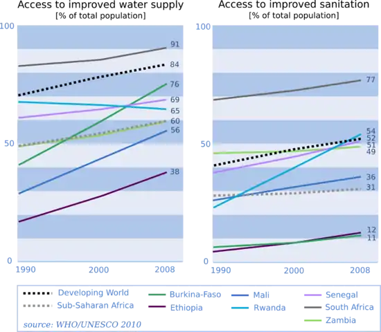 Although access to water supply and sanitation in Sub-Saharan Africa has been steadily improving over the last two decades, the region still lags behind all other developing regions. Access to improved water supply had increased from 49% in 1990 to 68% in 2015,[1] while access to improved sanitation had only risen from 28% to 31% in that same period. Sub-Saharan Africa did not meet the Millennium Development Goals (MDGs, 1990–2015) of halving the share of the population without access to safe drinking water and sanitation between 1990 and 2015.[2] There still exists large disparities among Sub-Saharan African countries, and between the urban and rural areas. The MDGs set International targets to reduce inadequate Water Sanitation and Hygiene (WASH) coverage and now new targets exist under the Sustainable Development Goals (SDGs, 2016–2030). The MDGs called for halving the proportion of the population without access to adequate water and sanitation, whereas the SDGs call for universal access, require the progressive reduction of inequalities, and include hygiene in addition to water and sanitation. Particularly, Sustainable Development Goal SDG6 focuses on ensuring availability and sustainable management of water and sanitation for all.[3]