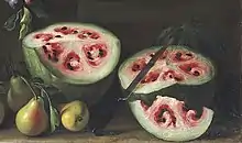 Kordofan melons from Sudan are the closest relatives and may be progenitors of modern, cultivated watermelons.[2] Wild watermelon seeds were found in Uan Muhuggiag, a prehistoric site in Libya that dates to approximately 3500 BC.[3] Watermelons were domesticated in Egypt by 2000 BC, although they were not the sweet modern variety. Sweet dessert watermelons spread across the Mediterranean world during Roman times.[4]