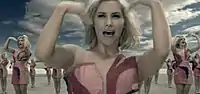 The music video for "Wear My Kiss" was directed by Martin Weisz during December 2009.[32] Weisz also directed the music video for the group's previous single "About a Girl".[33] The video for "Wear My Kiss" was expected to premiere in early January 2010, although a preview was released on 11 January 2010 instead.[34] The video was released on the iTunes Store on 12 March 2010.[35] The green screen was used to produce it, in which the Sugababes stood in front of a projection of their computer-generated images.[34] All three members wore similar blue, pink and red dresses.[34] It primarily focuses on Sugababes dancing in front of a crowd of clones of themselves.[34] Ewen discussed the experiences while filming the music video with First News, saying: