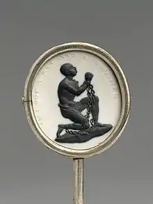 The Wedgwood anti-slavery medallion was an abolitionist symbol produced and distributed by British potter and entrepreneur Josiah Wedgwood in 1787 as a seal for the Society for the Abolition of the Slave Trade. The medallion depicts a kneeling Black man in chains with his hands raised to the heavens; it is inscribed with the phrase "Am I not a man and a brother?”[1][2]
