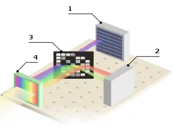Weighing matrices appear in the engineering of spectrometers, image scanners,[6] and optical multiplexing systems.[5] The design of these instruments involve an optical mask and two detectors that measure the intensity of light. The mask can either transmit light to the first detector, absorb it, or reflect it toward the second detector. The measurement of the second detector is subtracted from the first, and so these three cases correspond to weighing matrix elements of 1, 0, and -1 respectively. As this is essentially the same measurement problem as in the previous section, the usefulness of weighing matrices also applies.[6]