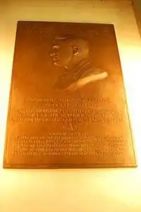 The Wendell Willkie plaque was placed in the Indiana Statehouse rotunda on February 18, 1950, which was the 58th anniversary of Willkie's birth. Approximately 500 people were in attendance to witness the dedication of the bronze plaque and to salute Willkie. Members of Willkie's family were also in attendance, including his widow, son, and brother: Mrs. Edith Willkie, Philip Willkie, and H. Frederick Willkie.[1] The plaque was placed on the main floor of the Indiana Statehouse rotunda in the southwest pier facing a bronze plaque bearing "The American's Creed".[3] Indiana Governor Henry F. Schricker accepted the plaque on behalf of the people of Indiana. An Indianapolis youth, Jack Scott, had the honor of pulling the veil from the plaque.[1]