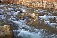 The drainage basin of West Branch Fishing Creek is designated as a High-Quality Coldwater Fishery and a Migratory Fishery, except for the drainage basins of the tributaries Shingle Mill Run and Elk Run, which are designated as Exceptional Value waters and Migratory Fisheries.[14] Wild trout naturally reproduce in the creek. However, dry stream beds often prevent wild brook trout from migrating up the creek.[1] Nevertheless, the creek has the highest population of wild brook trout of any major stream in the upper Fishing Creek watershed.[1] In an electrofishing survey done by the Fishing Creek Sportsman Association, 17 sculpin, 11 wild brook trout, 7 escaped (and unidentified) trout, 6 hatchery brown trout, and 1 hatchery brook trout were observed on the creek.[1] The creek is designated by the Pennsylvania Fish and Boat Commission as Class A Wild Trout Waters from its source to the tributary Hemlock Run, a distance of 2.50 miles (4.02 km).[5]