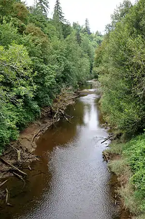 About 17 miles (27 km) from the mouth, the river turns west and a mile later descends Stulls Falls and turns south once more. Turning west near RM 14 (RK 23), the river goes over Henrys Falls, meandering generally south-southwest thereafter. Schumacher Creek enters from the right before the river passes over Pidgeon Falls and receives Totten and Daggett creeks from the right about 7 miles (11 km) from the mouth.[4][5] The river then flows by a stream gauge maintained by the Coos Watershed Association.[6] Turning south once again, the river flows around Devils Elbow and receives Rainy Creek from the left before meeting the East Fork Millicoma River at Allegany.[4][5] The West Fork Millicoma Road runs roughly parallel to the river from Allegany to Stalls Falls, and logging roads reach the headwaters.[7]