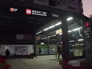 West Lake Cultural Square (Chinese: 西湖文化广场) is a station on Line 1 of the Hangzhou Metro in China.[1][2] It was opened in November 2012, together with the rest of the stations on Line 1. It is located at Xihuwenhua Square, in the Xiacheng District of Hangzhou. The station is designed to accommodate a paired cross-platform interchange with Line 3.