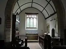 The chancel dates from the 13th century, with some alterations in the late 18th century. The nave and the tower (south of the nave) were rebuilt in 1840; the rebuilding used the original foundations, and so the chancel is not quite aligned with the nave, being slightly to the south. The stone font is of the 13th century. The tiled floor and seating were fitted in 1912.[3][5]