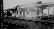The New Haven & New London Railroad was chartered in 1848, began construction in 1850, and opened for service in July 1852.[3] A station was located on the north side of the tracks off Essex Road (the modern location) just north of downtown Westbrook.[4] The line was owned by the New York, Providence and Boston Railroad (the "Stonington Road") from 1858 to 1862, and by the Shore Line Railway from 1864 until it was acquired by the New York, New Haven, and Hartford Railroad (the "New Haven") in 1870.[3] The original 1852-built Westbrook combination depot still stands just north of the tracks at the original site, although it has been turned and moved slightly back from the tracks. A NYP&B emblem from the 1858-1862 ownership was formerly displayed on one end of the building.[5]
