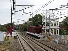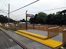 After demolition work over the next several months, the new parking lot was graded in June 2012 and a temporary platform was constructed west of the old one.[11] Construction of the 204-foot-long platforms took place in the third quarter of 2012, while the pedestrian bridge was lifted into place in March 2013.[13] The station was delayed by the unexpected discoveries of a buried concrete mass and utilities under the new station site.[14] The new station was formally opened on March 25, 2014.[2] Full bidirectional service to Westbrook began with the schedule change of May 11, 2014.[15]