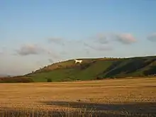 Westbury or Bratton White Horse is a hill figure on the escarpment of Salisbury Plain, approximately 1.5 mi (2.4 km) east of Westbury in Wiltshire, England. Located on the edge of Bratton Downs and lying just below an Iron Age hill fort, it is the oldest of several white horses carved in Wiltshire.[1] It was restored in 1778, an action which may have obliterated another horse that had occupied the same slope. A contemporary engraving from around 1772 appears to show a horse facing in the opposite direction that was rather smaller than the present figure. There is, however, no documentation or other evidence for the existence of a chalk horse at Westbury before 1772.