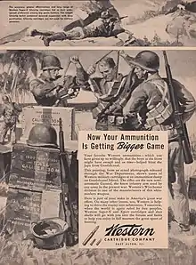 John Olin, the son of founder Franklin W. Olin, improved shotgun cartridge designs in the 1920s by using harder shot and progressive burning powder.[8] Western produced 3 billion rounds of ammunition in World War II, and the Winchester subsidiary developed the U.S. M1 carbine and produced the carbine and the M1 rifle during the war. Western ranked 35th among United States corporations in the value of wartime production contracts.[9] Cartridges made by Western are stamped WCC. Western Cartridge Company produced the now collectible "Western Xpert" brand of shotgun shells in both 12 and 16 gauge sizes.