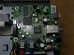 This drive runs BusyBox on Linux on an Oxford Semiconductor 0XE800 ARM chip which has the ARM926EJ-S core. In addition it uses a VIA Cicada Simpliphy vt6122 Gigabit Ethernet chipset, and a Hynix 32 Mbit DDR Synchronous DRAM chip. The webserver is the mini_http server, although older "bluerings" use Lighttpd. The drives of the World Edition are xfs or ext3 formatted, which means that the drive can be mounted as a standard drive from within Linux if removed from the casing and installed in a normal PC.