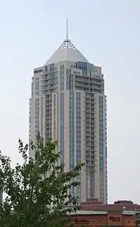 The Westin Virginia Beach Town Center is a 38 story high rise hotel and living residence in Virginia Beach Town Center. The 4 star, 236-room hotel occupies the first 15 floors of the building, while the upper stories are residential. The 119 condominiums in the top floors range from 900 to 4,000 square feet (370 m2). Construction began in 2006. Upon completion in 2008, it became the tallest building in Virginia, surpassing the James Monroe Building in Richmond. [2] In 2018, the hotel portion of the building was renovated.[3]