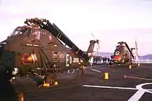 The Wessex was a major operational shift for the Fleet Air Arm, enabling the RAN to proceed with the conversion of the aircraft carrier HMAS Melbourne as an anti-submarine platform.[33] In typical carrier operations, a Wessex would be deployed during the launch and recovery of fixed-wing aircraft as a guard helicopter; during anti-submarine patrols, routine procedure was to have one Wessex airborne to actively screen the ship while a second would be fully armed and prepared for operations, such an arrangement was used during troop transport deployments by HMAS Sydney to Vietnam during the 1960s.[32] Performing search and rescue sorties became another valued role of the type; in 1974, multiple Wessex helicopters participated in the relief effort in Darwin in the aftermath of Cyclone Tracy.[32]