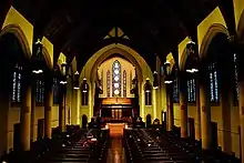 The 1926 building was designed by Ralph Adams Cram.[1] A commenter writing in the Oakland Tribune called the interior exceptional for its "sense of intimacy and sheer eloquent beauty."[1]