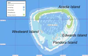 The atoll consists of four islets: Acadia—which is by far the largest—Pandora, Westward and Edwards.[35] All three of the smaller islets can be accessed on foot from Acadia at low tide.[31] The islets were named by Harald Rehder and John Randall, who visited the atoll during an expedition by the Smithsonian Institution in 1975.[36]
