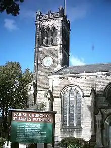 There are five churches in Wetherby.[35] The parish church is dedicated to St James[36] and its daughter church The Church on the Corner meets in the old Cemetery Chapel on Hallfield Lane.