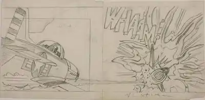 Whaam! adapts a panel by Irv Novick from the "Star Jockey" story from issue No. 89 of DC Comics' All-American Men of War (Feb. 1962).[22][23][24] The original forms part of a dream sequence in which fictional World War II P-51 Mustang pilot Johnny Flying Cloud, "the Navajo ace", foresees himself flying a jet fighter while shooting down other jet planes.[25][26] In Lichtenstein's painting, both the attacking and target planes are replaced by different types of aircraft. Paul Gravett suggests that Lichtenstein substituted the attacking plane with an aircraft from "Wingmate of Doom" illustrated by Jerry Grandenetti in the subsequent issue (#90, April 1962),[27] and that the target plane was borrowed from a Russ Heath[28] drawing in the third panel of page 3 of the "Aces Wild" story in the same issue No. 89.[27] The painting also omits the speech bubble from the source in which the pilot exclaims "The enemy has become a flaming star!"[29]