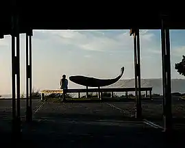 Whale is a 9-foot (2.7 m) sculpture installed at,[1] and the namesake of, Whale Park (or Hemlock Street Park),[2][3] located at the north end of downtown Cannon Beach. The sculpture commemorates the visit by members of the Lewis and Clark Expedition's Corps of Discovery in January 1806, including William Clark and Sacagawea, who explored the area to investigate reports of a beached whale.[4][5] It measures 4 feet (1.2 m) x 3.5 feet (1.1 m) x 10 feet (3.0 m) and is positioned horizontally on top of two metal posts anchored in a concrete base which is 2 feet (0.61 m) tall. The whale's head and tail are elevated. The underside of its proper right flipper contains an unintelligible signature by the artist which may read "Hartwick".[2] The original artist that carved the wood sculpture was Gregory Alan Hartwick.
