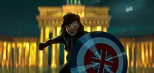 During World War II, Steve Rogers is chosen to become the world's first super-soldier, but is wounded by a Hydra spy before he can receive the super-soldier serum. SSR agent Peggy Carter kills the spy and receives the serum instead. She is enhanced but banned from combat by SSR leader John Flynn. After she takes the Tesseract from Hydra with a vibranium shield created by inventor Howard Stark, Flynn reluctantly promotes her to the combat role of "Captain Carter". Stark uses the Tesseract to create a weaponized, armored suit for Rogers to pilot as the "Hydra Stomper". Carter and Rogers fight many battles until he goes missing while attacking a Hydra train. Carter and her allies find Rogers when they infiltrate a Hydra base and see Red Skull using the Tesseract to open a portal and summon an interdimensional creature, which kills him. Carter enters the closing portal to force the creature back. Almost 70 years later, the Tesseract opens another portal from which Carter emerges, meeting Nick Fury and Clint Barton. Cast : Hayley Atwell as Peggy Carter / Captain Carter, Sebastian Stan as Bucky Barnes, Dominic Cooper as Howard Stark, Stanley Tucci as Abraham Erskine, Toby Jones as Arnim Zola, Bradley Whitford as John Flynn, Ross Marquand as Johann Schmidt / Red Skull, and Darrell Hammond as a Nazi general | |||||