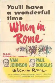 When in Rome is a 1952 film directed by Clarence Brown and starring Van Johnson, Paul Douglas, and Joseph Calleia. The film was released by Metro-Goldwyn-Mayer, and was based on a story by Robert Buckner, Dorothy Kingsley, and Charles Schnee. The picture opens with the following text: ”1950 was a Holy Year. Three million pilgrims from every part of the world thronged to Rome, the Eternal City. Our story is about two men who journeyed to Rome that year. One was Father John X. Halligan, a young priest from Coletown, Pennsylvania, whose mission was a holy one. The other was Joe Brewster, late of Sing Sing, San Quentin, Joliet and Atlanta, whose mission was not so holy. If our story has a moral, it’s a simple one. God may move in mysterious ways, but He gets there just the same.”