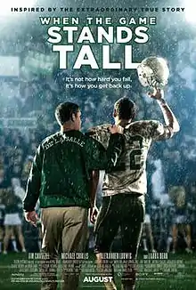 When the Game Stands Tall is a 2014 American sports drama film directed by Thomas Carter and starring Jim Caviezel as Coach Bob Ladouceur, Laura Dern as Bev Ladouceur, Michael Chiklis as assistant coach Terry Eidson and Alexander Ludwig as running back Chris Ryan. The plot concerns the record-setting 151-game 1992–2003 high school football winning streak by De La Salle High School of Concord, California.[3][4] The film is an adaptation of the 2003 book of the same name by Neil Hayes, published by North Atlantic Books. De La Salle head coach Bob Ladouceur retired in January 2013 after winning his last Open Division state championship in December 2012.[5] The film was released on August 22, 2014.