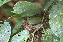 The white-bearded manakin (Manacus manacus) is a small passerine bird which breeds in tropical South America. It is found from Colombia, Venezuela and Trinidad south to Bolivia and northern Argentina. This manakin is found in forests, secondary growth and plantations. It is a small, plump bird about 10.7 centimetres (4.2 in) long. Males have a black crown, upper back, wings and tail and are otherwise white. Females are olive-green and resemble female golden-headed manakins. At breeding time, males are involved in lekking behaviour on the forest floor during which they puff out their neck feathers. This is a fairly common species with a wide range, and the International Union for Conservation of Nature has rated its conservation status as being of "least concern".