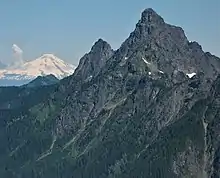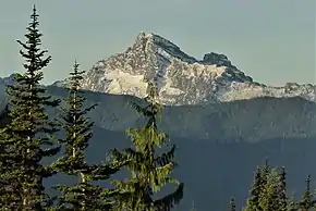 White Chuck Mountain, or native name Hi Khaed,[3] is a 6,989 ft (2,130 m) summit near the western edge of the North Cascades, in Snohomish County of Washington state. It is located southeast of Darrington, Washington, east of the Mountain Loop Highway, and northwest of Glacier Peak which is one of the Cascade stratovolcanoes. It is situated at the confluence of the White Chuck River and the Sauk River on land administered by the Mount Baker-Snoqualmie National Forest. The mountain is named for the White Chuck River, which "chuck" in Chinook Jargon means "water".[4] The nearest higher neighbor is Mount Pugh, 4.9 miles (7.9 km) to the south-southeast.[1]