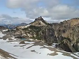 White Goat Mountain is a 7,800+ ft (2,380+ m) mountain summit located in the Glacier Peak Wilderness of the North Cascades in Washington state.[3] The mountain is situated in Chelan County, on land managed by Wenatchee National Forest. Its nearest higher neighbor is Tupshin Peak, 0.7 mi (1.1 km) to the northeast, and Devore Peak is 1.02 mi (1.64 km) to the south.[1] Precipitation runoff from the peak drains to nearby Lake Chelan via Company and Devore Creeks. The first ascent was made September 10, 1940, by Everett and Ida Zacher Darr, Joe Leuthold, and Eldon Metzger.[4] A herd of mountain goats beneath the peak was their inspiration for so naming this geographical feature.[4]