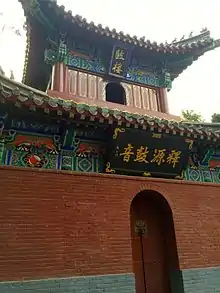 In addition, the 'Cool and Clear Terrace' known as the 'Qingliang Terrace' is behind the main hall, the place where the original sutras were translated.[1][6] This terrace is amidst bamboo forest of old pine trees and has halls which are interconnected. Four sides of the terrace are piled with green bricks. The central building of the terrace is the Vairocana Pavilion, which was originally constructed during the Han dynasty. The present building dates back to the Ming dynasty and was built with a xieshan style roof with double eaves. The pavilion principally enshrines statues of Vairocana Buddha and the Bodhisattvas Manjushri and Samantabhadra. In addition, a total of 5,050 wood-carved Buddha statues, made with incense ash, are enshrined on both sides of the pavilion. The terrace also has the Kunlu Pavilion with halls on its east and west that house the statues of the two eminent monks, She Moteng and Zhu Falan. They were buried inside the temple gate after they died here; the Bell Tower and the Drum Tower, in front of their tombs, were once prominent sights of Luo Yang City.[6]