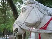 The temple faces south and is aligned along a central axis starting from the entrance gate followed by several halls and courtyards in succession.[6] The temple compound covers an area of 200 mu (13 hectares (32 acres)) and faces south. A stone paifang (archway), a three-door covered archway, has been recently built, 150 metres (490 ft) in front of the original gate. The stone horses at the front of the temple are in the Ming architectural style, representing the white horses which carried the scriptures and the Indian monks to China. Between the archway and gate lies a pool with fountains, crossed by three stone bridges.[6][29] The two horses at the entrance gate facing each other are made of green stone dated to the Song dynasty (960–1279).[6]