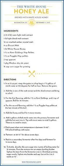 White House Honey Ale is the first beer known to have been brewed in the White House.[1] The process began in January 2011[2] at the request of President Barack Obama who purchased the homebrewing kit using his personal funds.[3] As of 2012, three styles have been brewed in addition to Honey Ale: White House Honey Blonde Ale, White House Honey Porter and White House Honey Brown.[4]