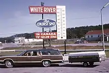 White River advertises itself as "The Coldest Spot in Canada" with recorded temperatures as low as −58 °C (−72 °F). However, this is a myth, as the coldest temperature in Canada was recorded in Snag, Yukon, at −62.8 °C (−81.0 °F) on 3 February 1947.[6] Even in Ontario, the coldest recorded temperature was in Iroquois Falls on 23 January 1935 [−58.3 °C (−72.9 °F)], which is also the lowest temperature ever recorded in Eastern Canada.[6] White River's reputation for being the "coldest spot" is probably based on the fact that for many years, its reported temperature was deemed "the coldest in the nation today" from the handful of stations reporting daily temperature extremes in newspapers and on radio, with most stations' data being available only on a monthly basis to Environment Canada at the time.