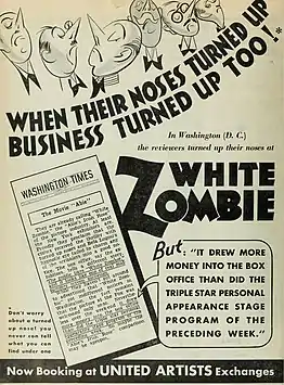 White Zombie premiered on July 28, 1932, in New York City's Rivoli Theatre. The film received a mixed box office reception upon its initial release, but was a great financial success for an independent film at the time.[42][43] In 1933 and 1934, the film experienced positive box-office numbers in small towns in the United States, as well as in Germany under the title Flucht von der Teufelsinsel. White Zombie was one of the few American horror films to be approved by the Nazis.[43] The popularity of the film led Victor Halperin to a contract with Paramount Studios.[30]