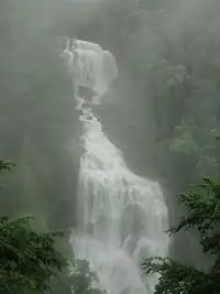 Whitewater Falls is a series of waterfalls and cascades on the Whitewater River in North Carolina and South Carolina. Over the 3.5 mi (5.6 km) course of the river between the two falls, the Whitewater River drops 1,500 ft (460 m), and crosses the state border. Both Falls can be hiked to via the Foothills Trail or spur trails. Lookouts allow you to view both falls.