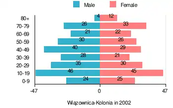 According to the 2002 Poland census, there were 497 people residing in Wiązownica-Kolonia village, of whom 51.1% were male and 48.9% were female. In the village, the population was spread out, with 25.4% under the age of 18, 33.4% from 18 to 44, 20.3% from 45 to 64, and 20.9% who were 65 years of age or older.[1]