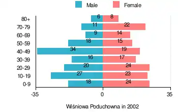 According to the 2002 Poland census, there were 325 people residing in Wiśniowa Poduchowna village, of whom 48.9% were male and 51.1% were female. In the village, the population was spread out, with 24.6% under the age of 18, 36.3% from 18 to 44, 19.1% from 45 to 64, and 20% who were 65 years of age or older.[1]