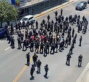 ![]() A large group of Los Angeles Police Department officers kettle a pro-trans protest group on South Commonwealth Avenue a few blocks away from Wi Spa on July 17, 2021. | ||||
