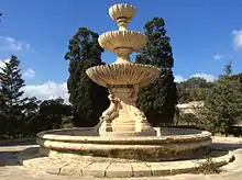 The "Pinto fountain" was inaugurated on 18 January 1746 by Grand Master Pinto.[51] When the square became a parade ground for the British military,[49] the fountain was first relocated close by to the Palace of Justice (later destroyed and replaced)[48] and then to St. Philip's Gardens in Floriana, where it remains today.[52] Architect Said says that the fountain was moved away by the knights, prior British rule, as evidenced with some paintings.[53]